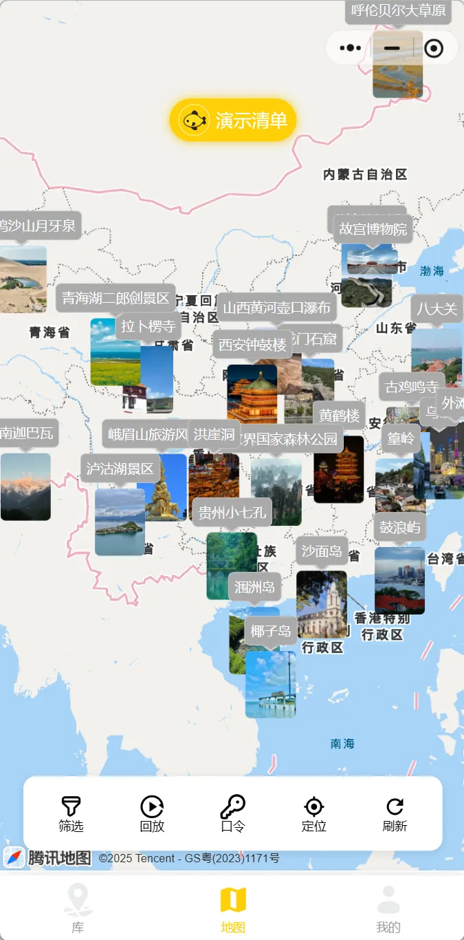 • 添加去过/想去的地点,并在地图上查看这些地点,可以上传原图和视频,形成自己的专属地点库