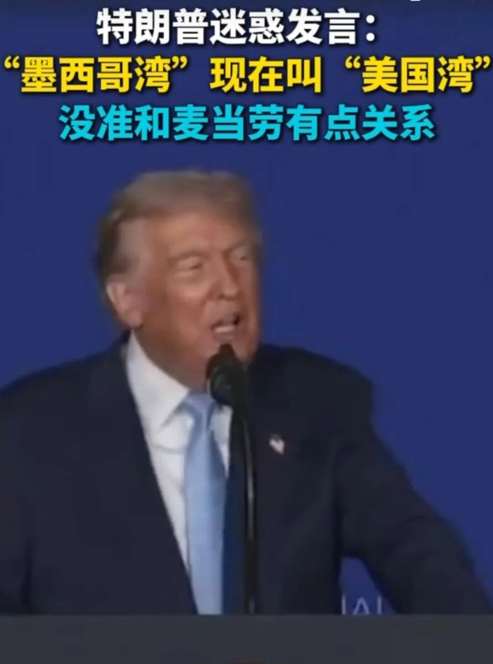 据海客新闻援引美国雅虎新闻网报道,当地时间17日,美国总统特朗普在麦当劳影响力峰会上发表演讲,在谈到关于墨西哥湾的问题时,他表示,“墨西哥湾”现在叫“美国湾”,也许和麦当劳有关系。