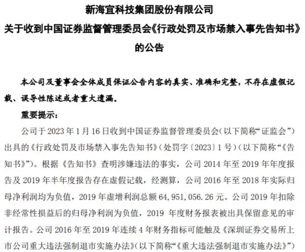 《告知书》明确,*ST新海在2016年至2018年,实际归母净利润均为负值,2019年虚增利润总额0.65亿元。结合《告知书》认定事实,*ST新海已触及重大违法强制退市情形。