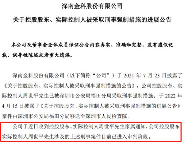 2022年9月20日,*ST深南公告称,公司控股股东、实控人周世平涉及的刑事案件,已进入审判阶段。
