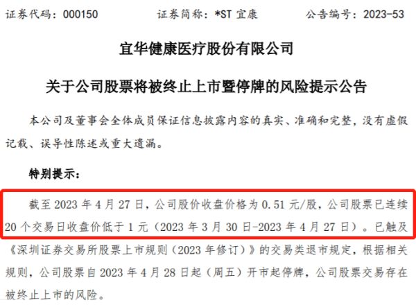 *ST宜康自2023年4月28日开市起停牌,公司股票交易存在被终止上市的风险。