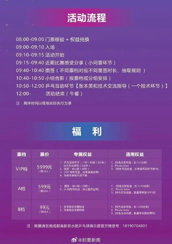 记者致电成都高新若水居乒乓球俱乐部,工作人员介绍,5999元档活动包含599元档的所有内容,此外还额外增加了与张本美和一起打球和共进餐食的环节。其中,“打球”环节时间较为有限,大约有三次击球互动机会,同时还有5分钟技术交流指导。