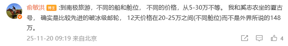 随后,他还在评论中回复:到南极旅游,不同的船和舱位, 不同的价格,从5-30万不等。 我和奚志农坐的夏古号, 确实是比较先进的破冰级邮轮, 12天价格在20-25万之间(不同舱位)而不是外界所说的148万。