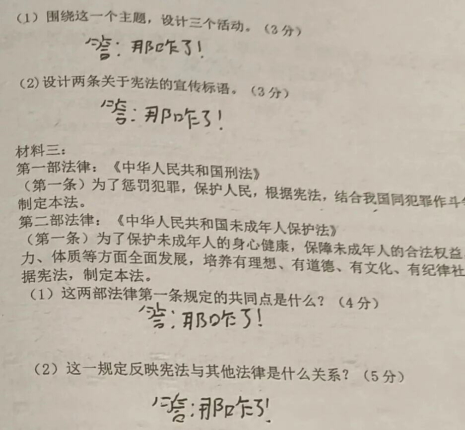 遇到不允许空着的大题,只写“解”字太窝囊,写“略”字又太敷衍,“那咋了”既凑了字数,又表明了态度,将它奉为所有试题的答案,再好不过。