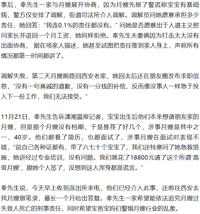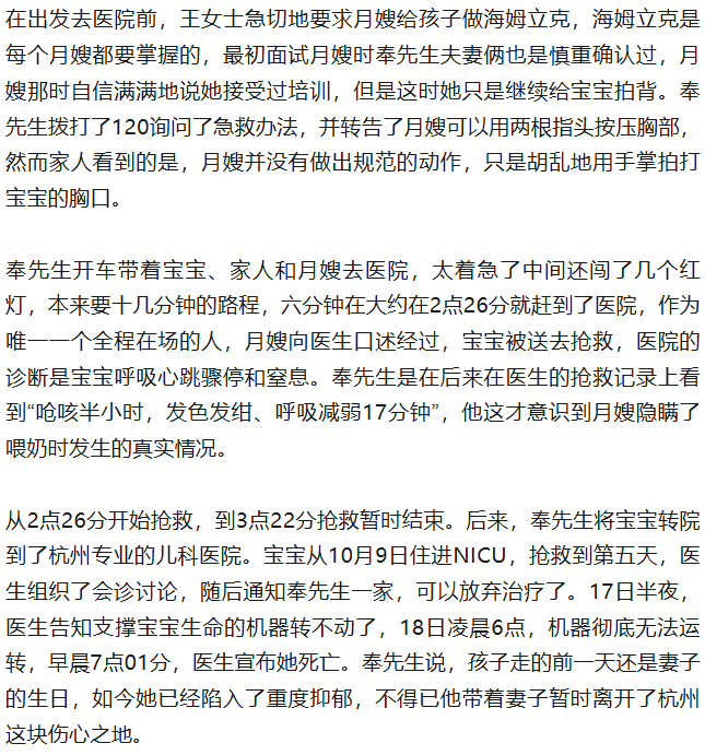 近日,杭州市的奉先生腾讯新闻热问上发声,称自己出生仅23天的女儿因为月嫂的严重失职不幸去世。奉先生认为,月嫂错误的喂奶方式、宝宝呛奶后未能及时处置甚至隐瞒呛奶情况,导致宝宝最终窒息死亡。