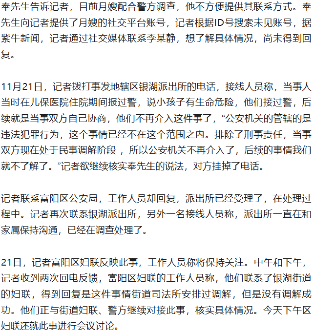 傍晚,妇联再次回复记者,他们与公安取得了联系,目前公安正在积极处置,相关案情也在调查核实当中,具体情况就不便透露了,以公安的口径为准。工作人员说,他们也会尽快联系上宝宝的父母,如果宝爸宝妈有需要,可以提供心理援助,“奉先生如果有需要的,我们会尽力。他们一家也是我们富阳区的人,不管是什么原因这个宝宝去世都是蛮可惜的,我们是非常同情的。我也作为一个母亲,也是希望可以帮助到他们一家人。不过目前还是请我们先相信公安,公安正在积极处理中。”