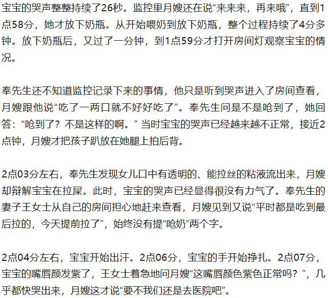 奉先生在事后查看房间监控才知道接下来发生的事。1点54分,月嫂开始喂奶,她没有开房间灯,只是开一个微弱到监控都识别不出光线的小夜灯喂奶。喂了大概一分多钟,在1点56分,宝宝发出了第一声呛咳的声音,紧接着是第二声、第三声。然后,就开始发出非正常的、持续的哭声,那种声音就像喘不上气一样,与宝宝刚醒来时的哭声完全不一样。