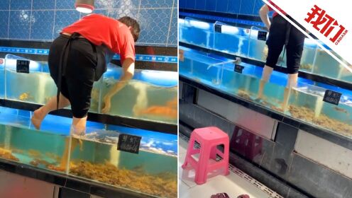 视频显示,女子赤脚踩的那个海鲜池上,贴有一个写着“对虾”字样的标牌。
