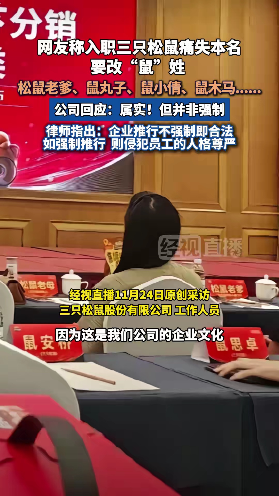近日,有网友发帖称,在入职三只松鼠后,员工会将自己的名字改为“鼠某某”。此事引发公众关注。经视直播记者就此事联系了三只松鼠股份有限公司,工作人员回应称,公司内部确实存在这样的做法。