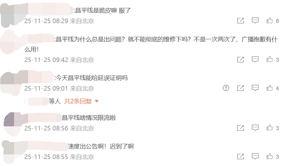 在北京地铁评论区下,多位网友反馈北京昌平线临时停车,导致多人上班迟到。