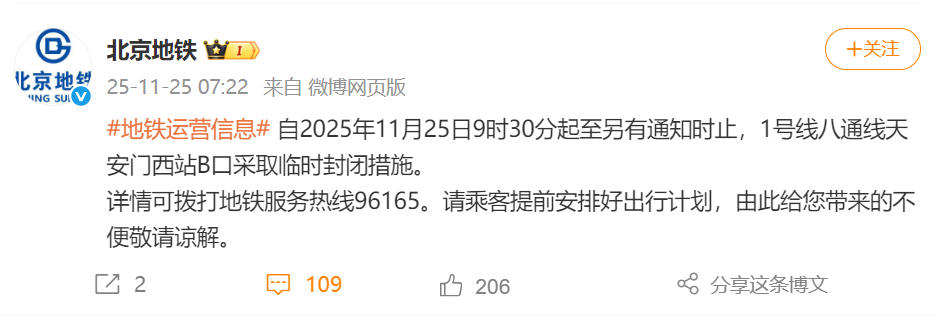 自2025年11月25日9时30分起至另有通知时止,1号线八通线天安门西站B口采取临时封闭措施。
