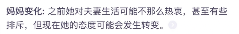 后续推送内容争议更大:11月27日的消息称“胎宝宝发育已稳定,无禁忌可适度性生活,有助于增进夫妻感情”;11月28日则推送“此前她对夫妻生活或许兴致不高甚至排斥,如今态度可能出现转变”。