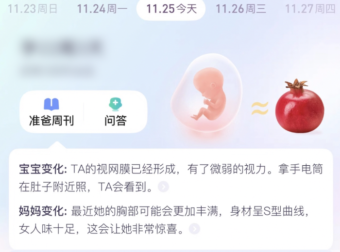 该网友晒出的推送截图显示,11月25日APP推送的“妈妈变化”板块提到,“最近她的胸部可能会更加丰满,身材呈S型曲线,女人味十足,这会让她非常惊喜”。对此,这位宝爸质疑:“特意用这种表述形容孕期妈妈?这个阶段的准妈妈会在意所谓的S曲线吗?”