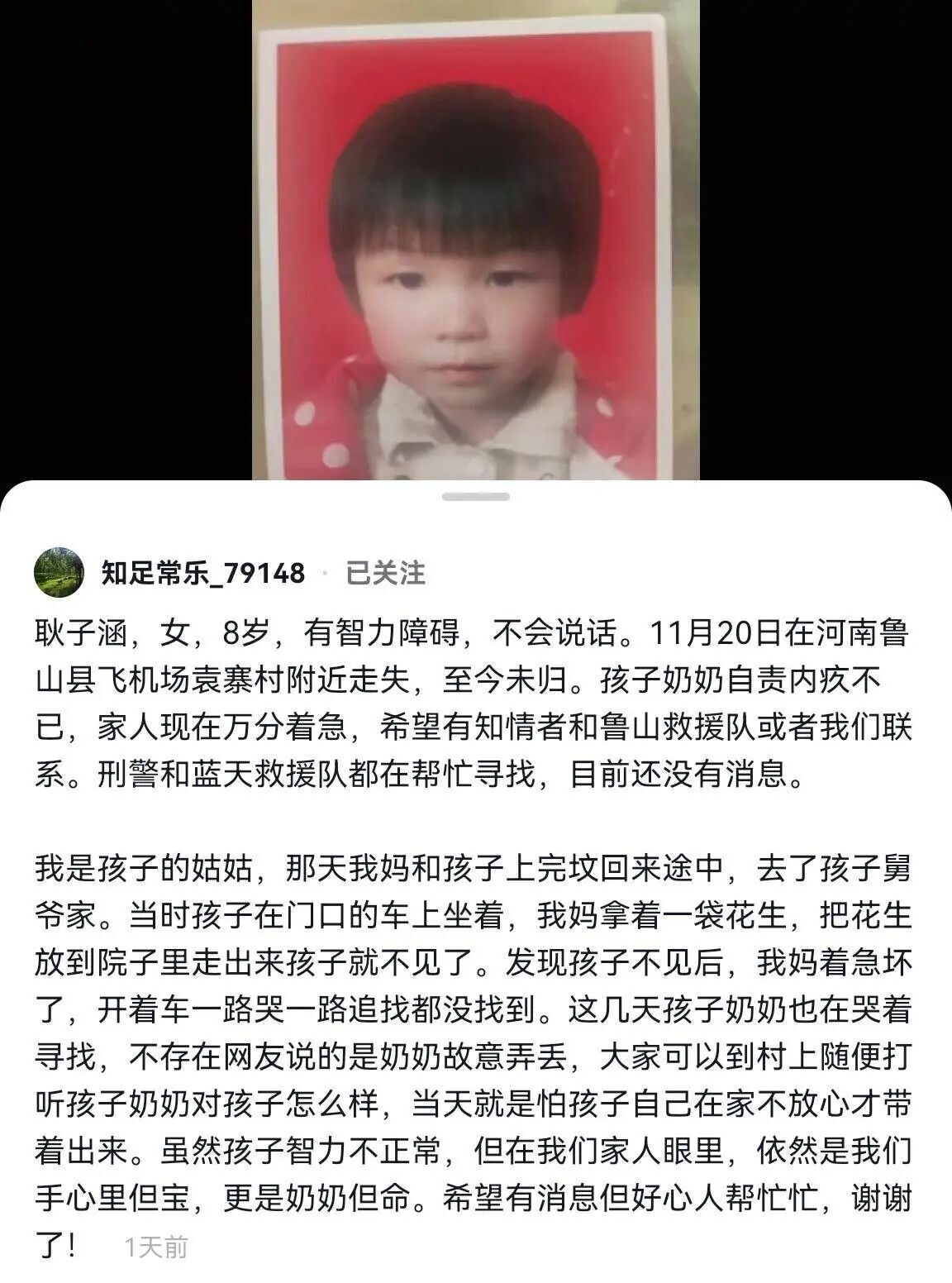 河南鲁山县8岁智力障碍女童耿子涵随奶奶上坟返回途中走失5天,25日下午在走失地附近一家养鸡场的化粪池被找到,已不幸遇难。11月26日,孩子的姑姑告诉极目新闻记者,还没敢告诉孩子的奶奶,怕她一时接受不了,今天准备叫了亲戚们一起和她说。
