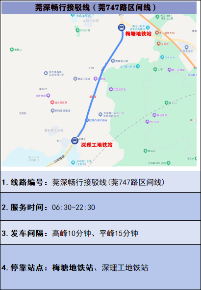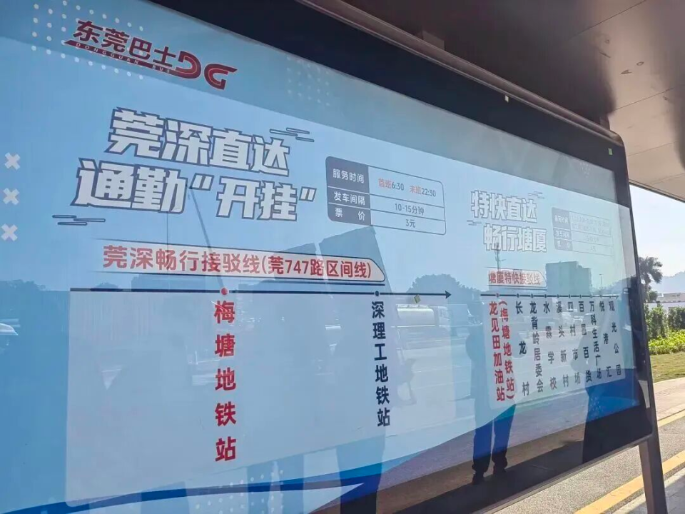 在东莞地铁1号线终点站梅塘站出站后,直接乘坐新开通的“莞深畅行接驳线”公交,直达深圳地铁深理工站。