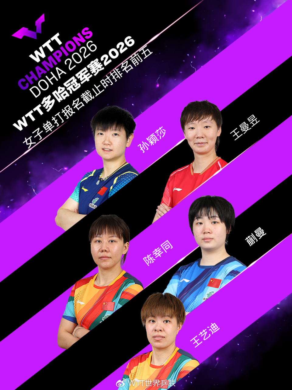WTT多哈冠军赛2026将于1月7日至11日在卢赛尔体育馆举办,本站赛事冠军将获得1000点世界排名积分。