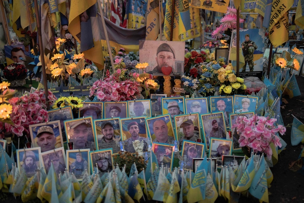 在基辅市中心克列夏季克大街、独立广场和欧洲广场,停电导致周边一片昏暗。在寒冷的阴雨中,市民们走过独立广场,神情倦怠。在独立广场西侧,一名携带行囊的乌军士兵凝视着插满悼念阵亡军人旗帜的草坪,神情茫然。“我叫基里洛·邦达连科,37岁。明天我就要重返前线,不知道是否还能活着回来。”邦达连科说。