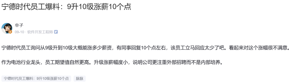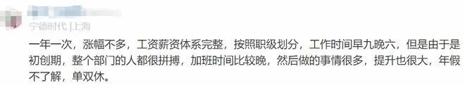 网络上也有一些宁德时代员工爆料的工资待遇,一位宁德时代的EHS工程师,月薪是15000元,年终奖4.5W。