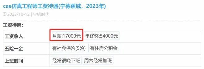一位宁德时代的cae仿真工程师,月薪是17000元,年终奖5.4W。