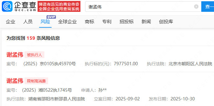 此外,查询资料发现,近期,谢孟伟新增两条被执行人信息。其中,谢孟伟与妻子郭珊珊被湖南省邵阳市新邵县人民法院执行约210万元,与郭珊珊、林某某、祖某某被北京市大兴区人民法院恢复执行500万元。
