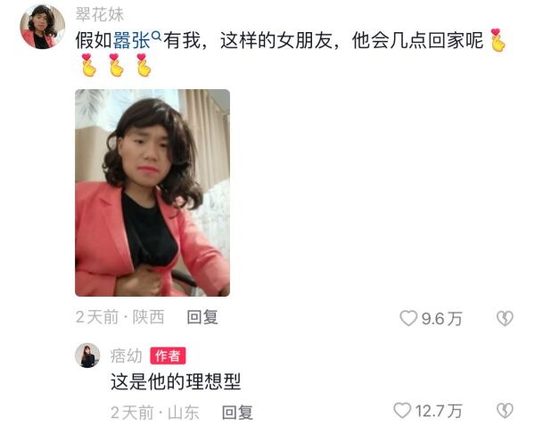 第四次,痞幼回复有关前男友的评论。网友发的是男生戴假发的照片,问:假如嚣张有我这样的女朋友,他会几点回家呢?痞幼说:这是他的理想型!暗指陆文臣品位低,喜欢得是长相一般、邋里邋遢的女生类型。