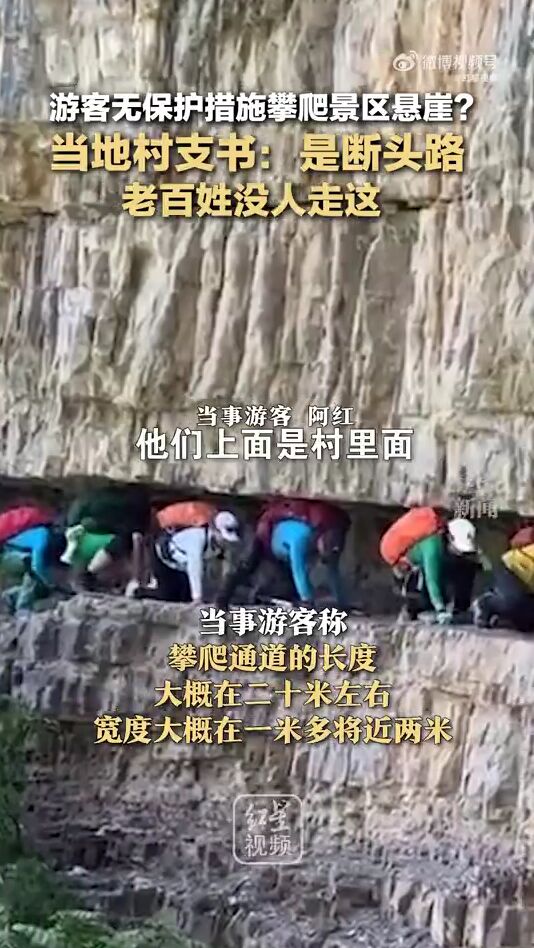 导读:4月29日,在河南林州,一群游客在没有任何安全保护措施的情况下,狗爬式过悬崖。一名参与爬行此过道的游客称,所有爬行者已经安全下山,下次一定注意。