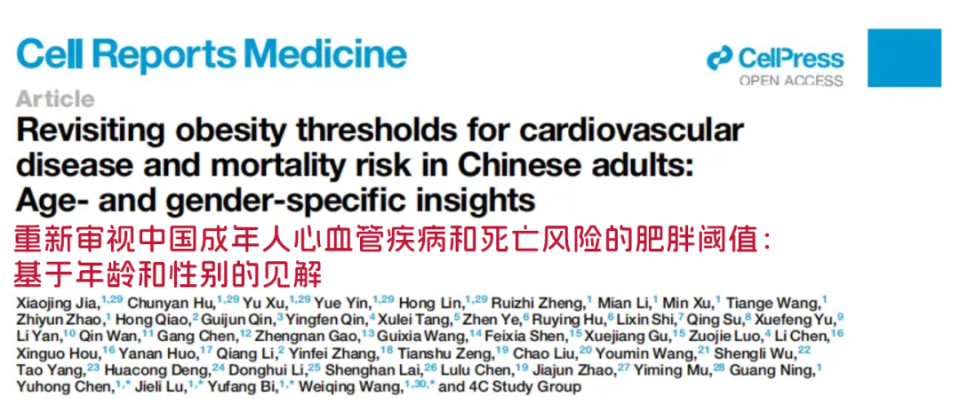 ①Revisiting obesity thresholds for cardiovascular disease and mortality risk in Chinese adults: Age- and gender-specific insights. Cell Rep Med. 2025 Aug 22:102309. doi: 10.1016/j.xcrm.2025.102309.