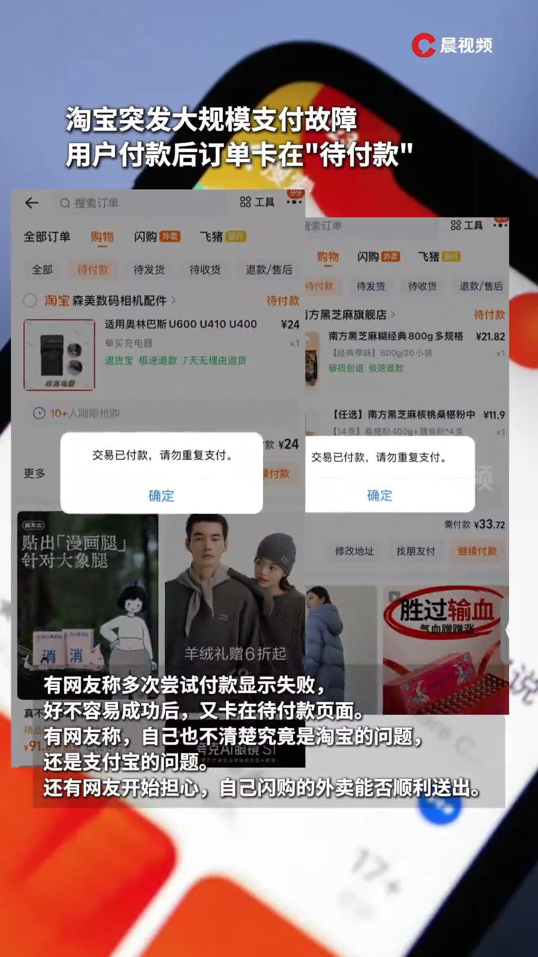有网友称在淘宝上多次尝试付款显示失败,好不容易成功后,又卡在待付款页面。网友称,自己也不清楚究竟是淘宝的问题,还是支付宝的问题。还有网友开始担心,自己闪购的外卖能否顺利送出。