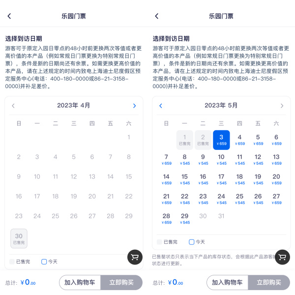 4月30日下午,记者搜索发现,上海迪士尼乐园五一假期多个单日门票已售罄。图片来源:迪士尼度假区app截图