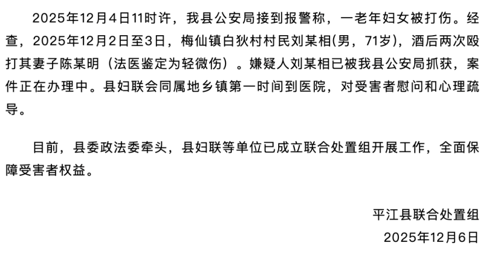 12月4日11时许,我县公安局接到报警称,一老年妇女被打伤。经查,2025年12月2日至3日,梅仙镇白狄村村民刘某相(男,71岁),酒后两次殴打其妻子陈某明(法医鉴定为轻微伤)。