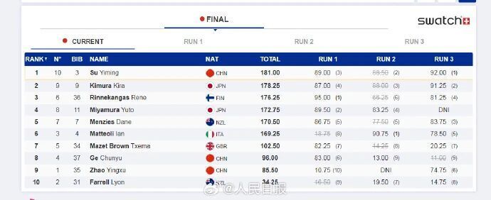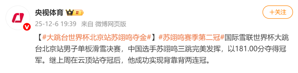 另据央视体育,国际雪联世界杯大跳台北京站男子单板滑雪决赛,中国选手苏翊鸣三跳完美发挥,以181.00分夺得冠军。继上周在云顶站夺冠后,他成功实现背靠背两连冠。