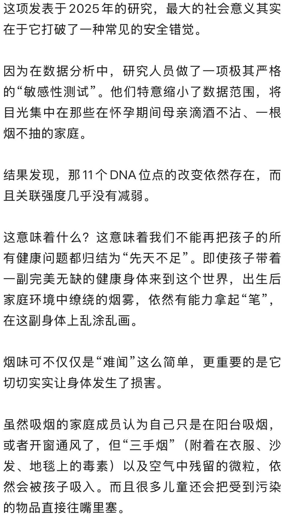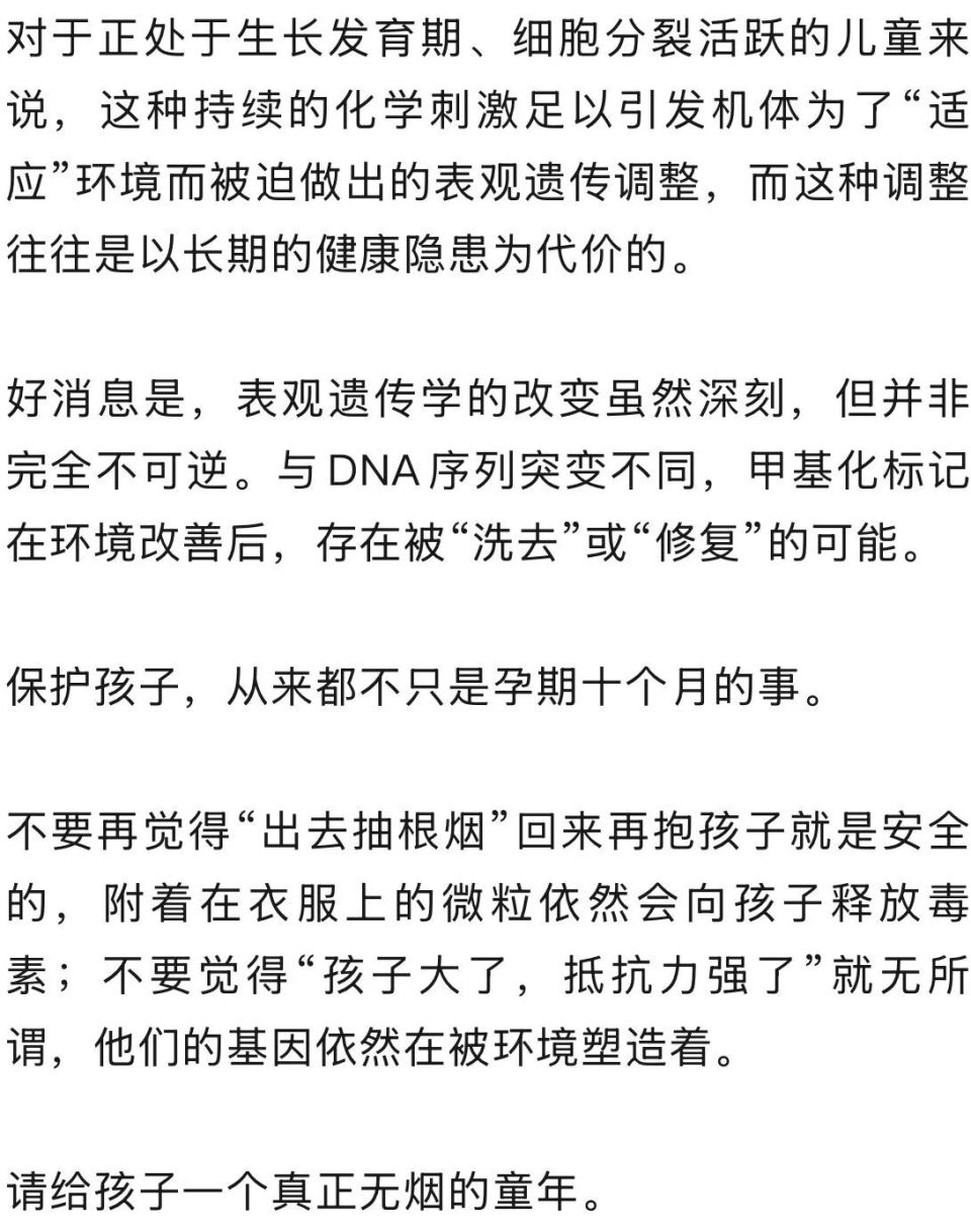 而本次揪出的2个“新面孔”,在以往关于成年人吸烟或单纯孕期暴露的研究中从未被明确锁定。这或许意味着,儿童时期的身体对二手烟有着独特的敏感性,某些特定的基因防线在童年时期更容易被烟雾攻破。