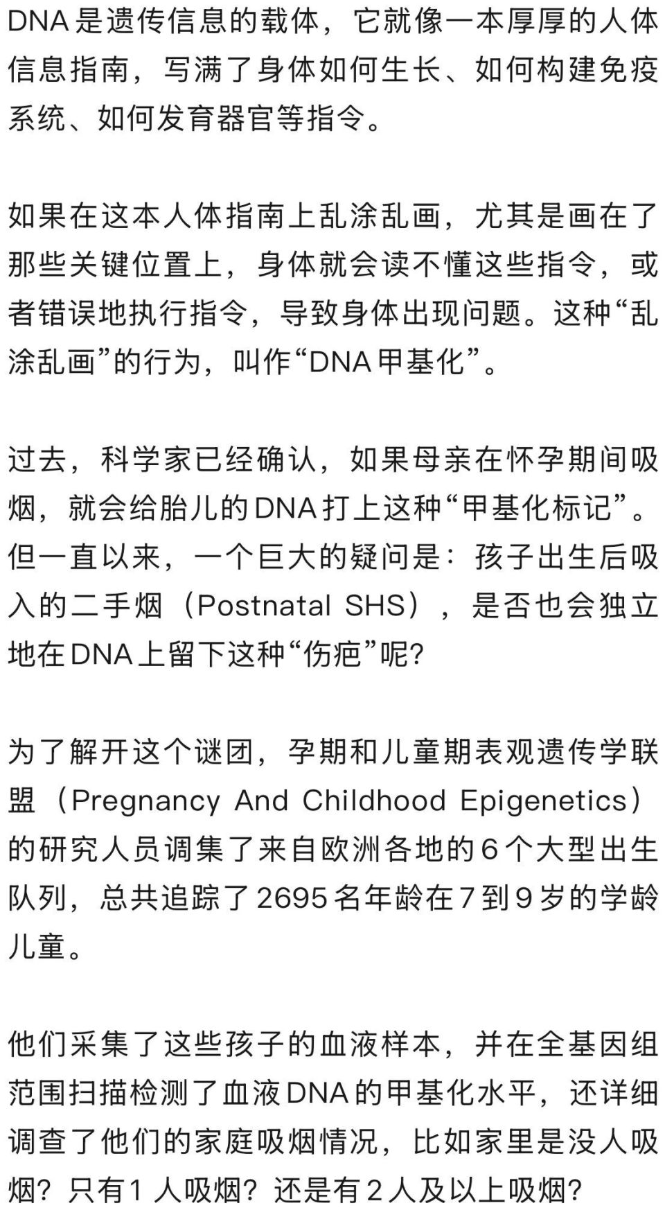 一项来自欧洲6个大型儿童队列共同开展的大规模跨国研究,首次证实了即便母亲在怀孕期间完全没有吸烟,只要孩子在成长过程中接触了家庭二手烟,他们的血液DNA就会发生显著的改变。