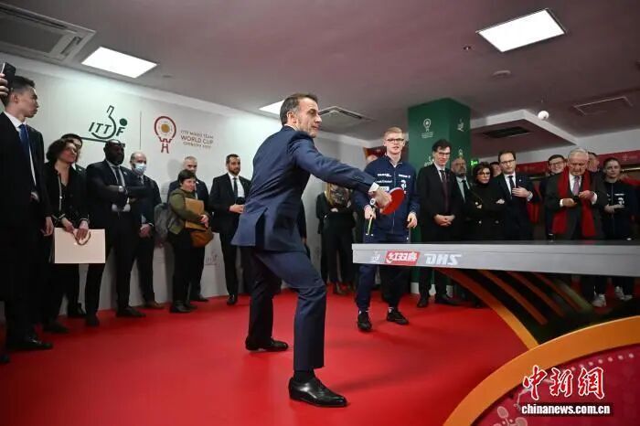 随后,马克龙前往四川省体育馆看望参加混团世界杯比赛的法国乒乓球运动员,并与法国队球员一起同中国乒乓球运动员切磋球技。