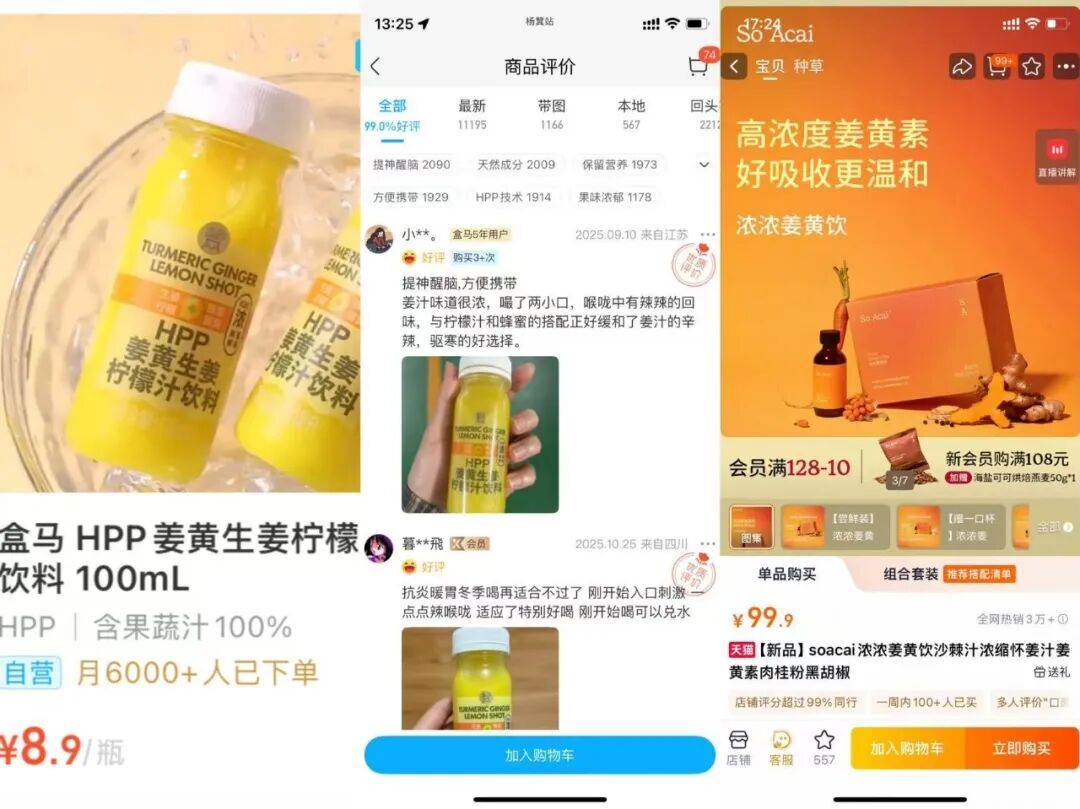 盒马App显示,盒马HPP姜黄生姜柠檬汁的月销售量超过6000,还经常出现“售空”“待补货”的标签。在最初上线不足一个月时,这款姜黄饮便成为盒马复购率最高的冷藏饮品,至今,它的好评率都高达99%。山姆的姜黄柠檬液也总是断货;淘宝数据显示,比盒马姜黄饮贵多了的So Acai的浓浓姜黄饮,16.7元一瓶、一瓶50毫升,全网销量也已超3万。