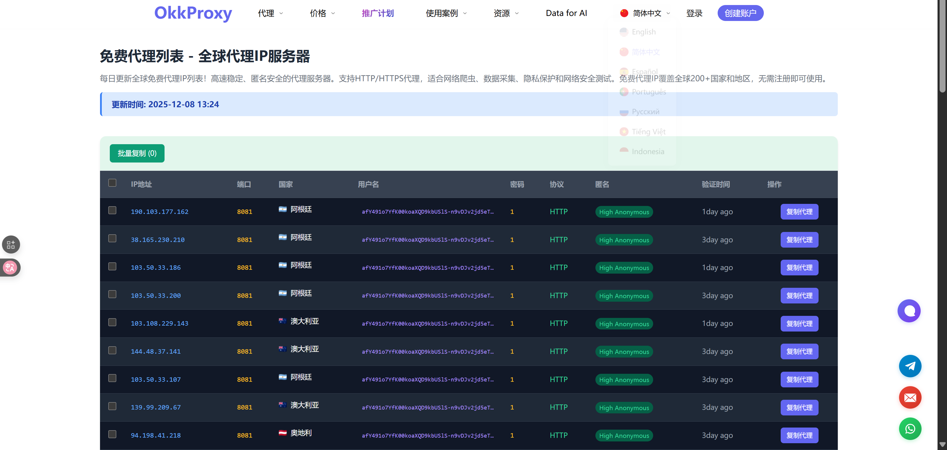首先,我们需要去寻找免费的“源头”。OkkProxy 提供了每日更新的全球免费代理列表。