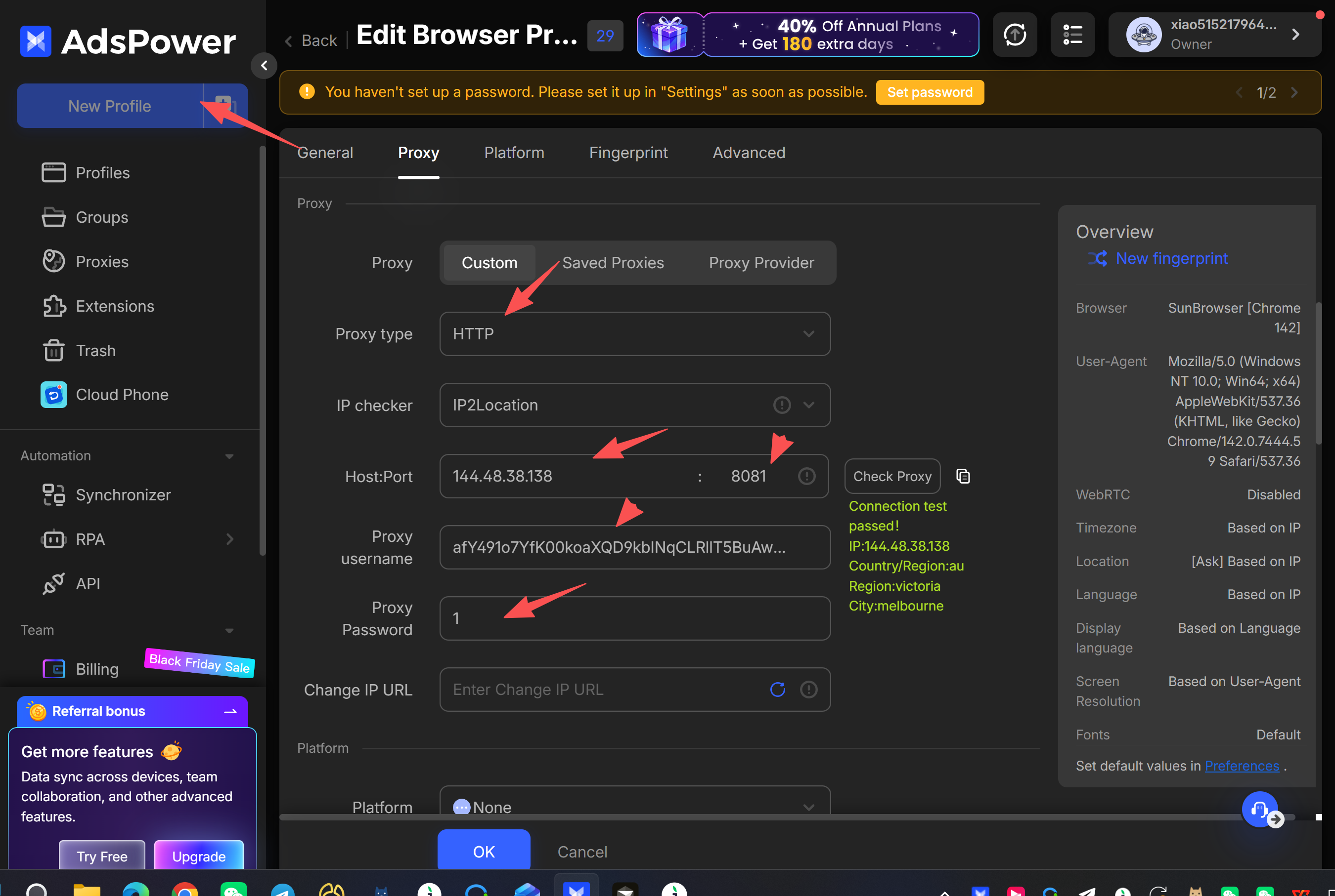 获取到 IP 信息后,我们需要将其配置到指纹浏览器中,以模拟真实的上网环境。这里以通用的指纹浏览器配置为例: