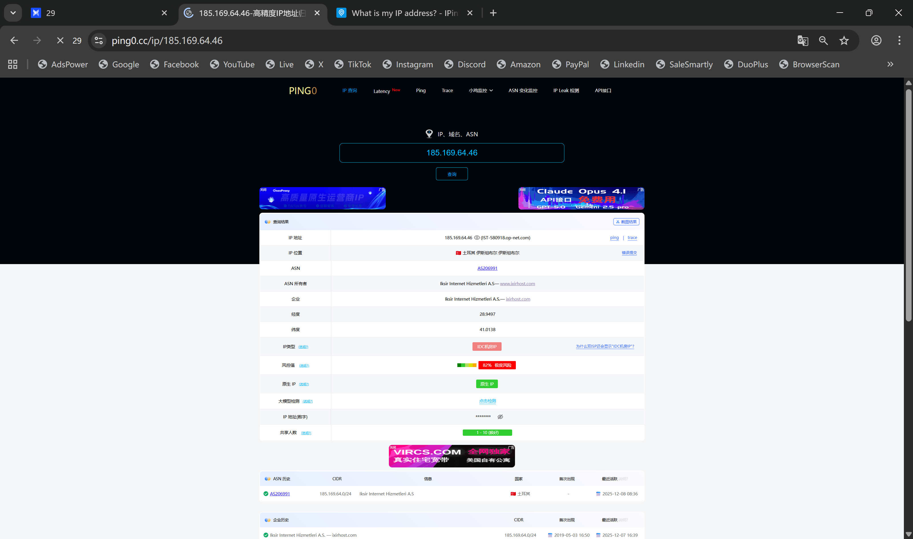 * 如果是 **Hosting** 或 **Business**,说明是机房/商业 IP(容易被风控)。