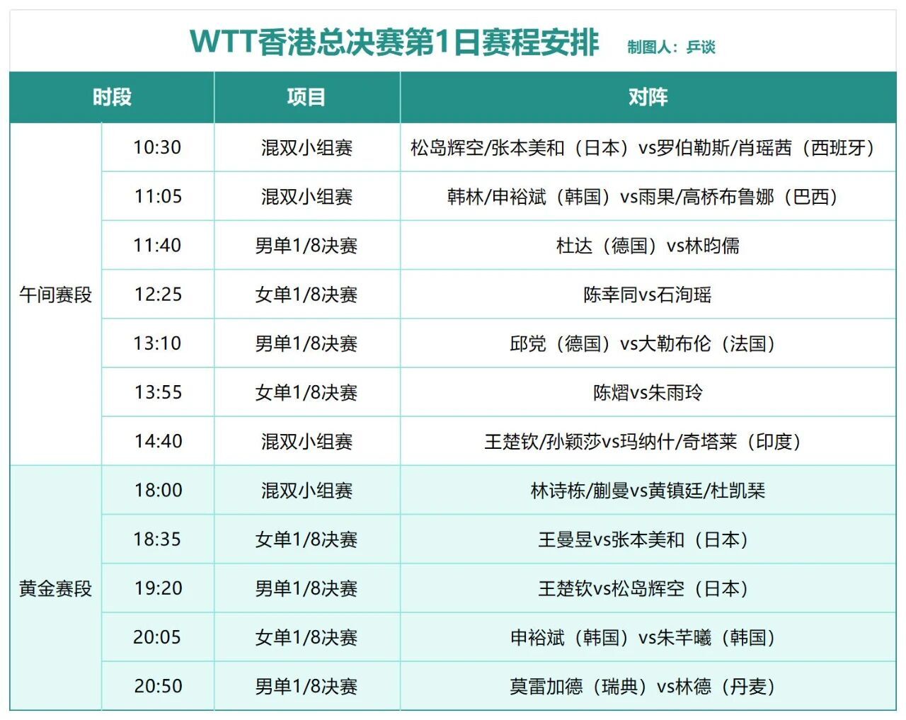 11:40 男单1/8决赛:杜达(德国)vs林昀儒12:25 女单1/8决赛:陈幸同vs石洵瑶单打项目,因为只有4轮,所以一上来就是7局4胜制。女单方面,16人当中有7个是国乒队员,6个是日本队员,所以不可避免,会出现同协会对决的情况,陈幸同和石洵瑶的这场比赛就是。