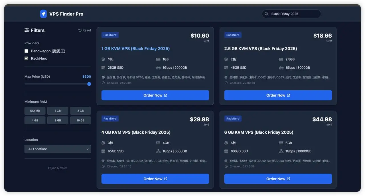 • 筛选器:目前收录了 RackNerd 和 搬瓦工 的套餐,支持按 价格 和 地区 快速过滤。