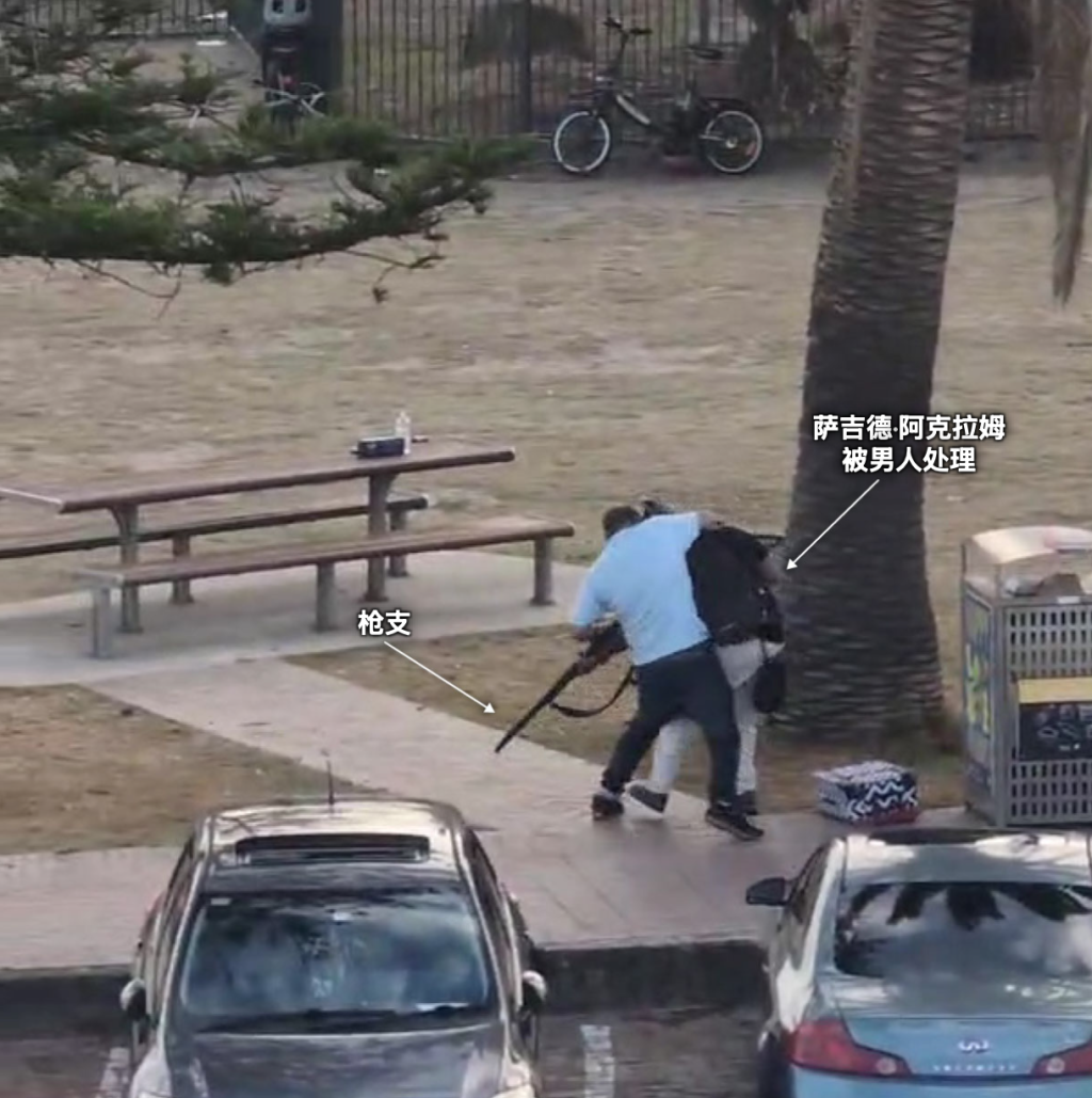 视频一开始,可以看到萨吉德·阿克拉姆用一把看似长枪管的武器向两名试图逃离的人开枪。这两人随后消失在一辆停放的汽车后方,未再起身。
