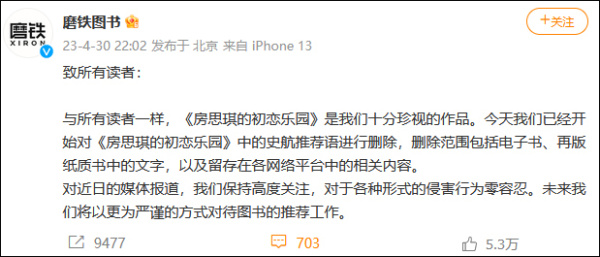 @磨铁图书 4月30日发布消息称,与所有读者一样,《房思琪的初恋乐园》是我们十分珍视的作品。今天我们已经开始对《房思琪的初恋乐园》中的史航推荐语进行删除,删除范围包括电子书、再版纸质书中的文字,以及留存在各网络平台中的相关内容。