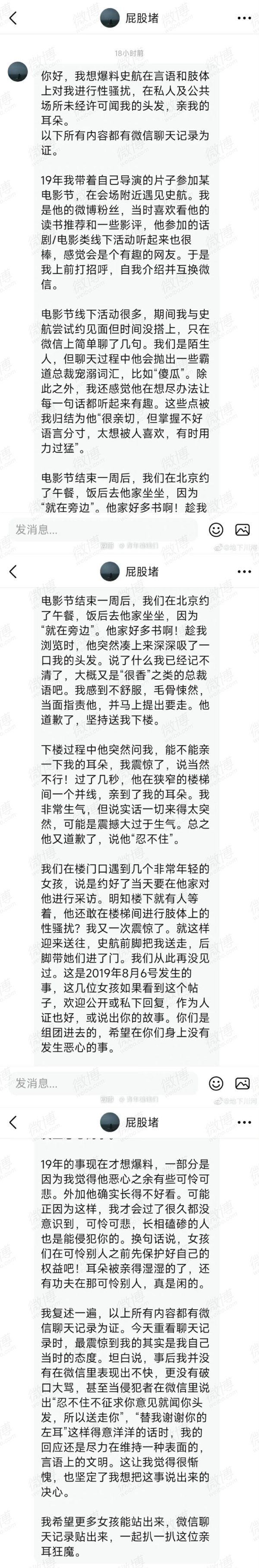 这篇投稿发出后,迅速在微博上传播,并于28日晚冲上了微博热搜。此后,又有多名受害者以匿名或实名的方式站出来,控诉史航用相似的方式对其进行性骚扰。截至发稿前,总共已经有6名受害者发声控诉。