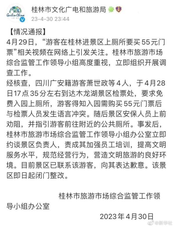 4月30日晚,广西壮族自治区桂林市旅游市场综合监管工作领导小组办公室发布通报,就“游客在桂林进景区上厕所要买55元门票”视频涉及的情况公布调查处置结果。