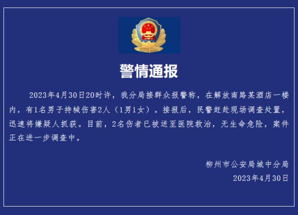 微信公众号“柳州城中警方”5月1日发布警情通报称,4月30日20时许,柳州市公安局城中分局接群众报警称,在解放南路某酒店一楼内,有1名男子持械伤害2人(1男1女)。接报后,民警赶赴现场调查处置,迅速将嫌疑人抓获。目前,2名伤者已被送至医院救治,无生命危险,案件正在进一步调查中。