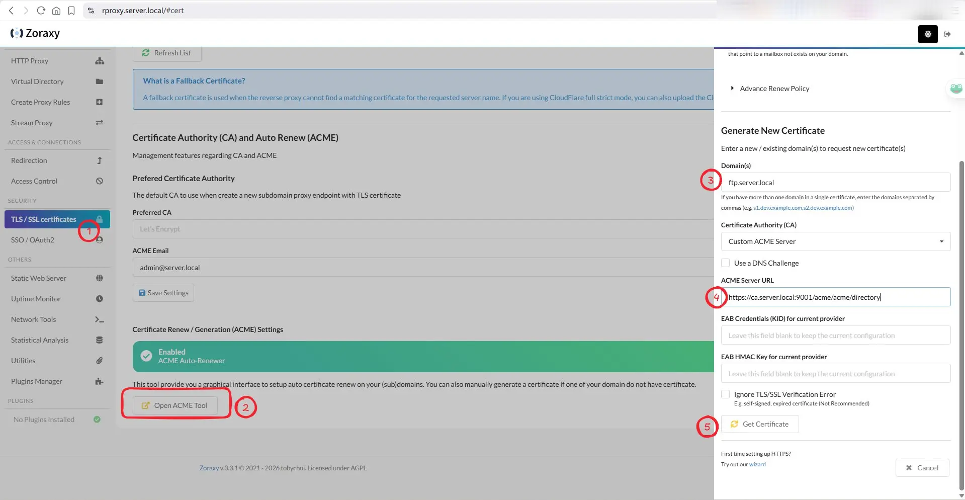 Zoraxy 内置 ACME 客户端功能,支持 Let's Encrypt 等服务商证书的自动申请:证书自动续期,不用担心过期。