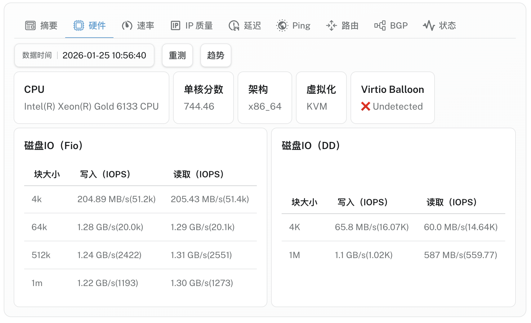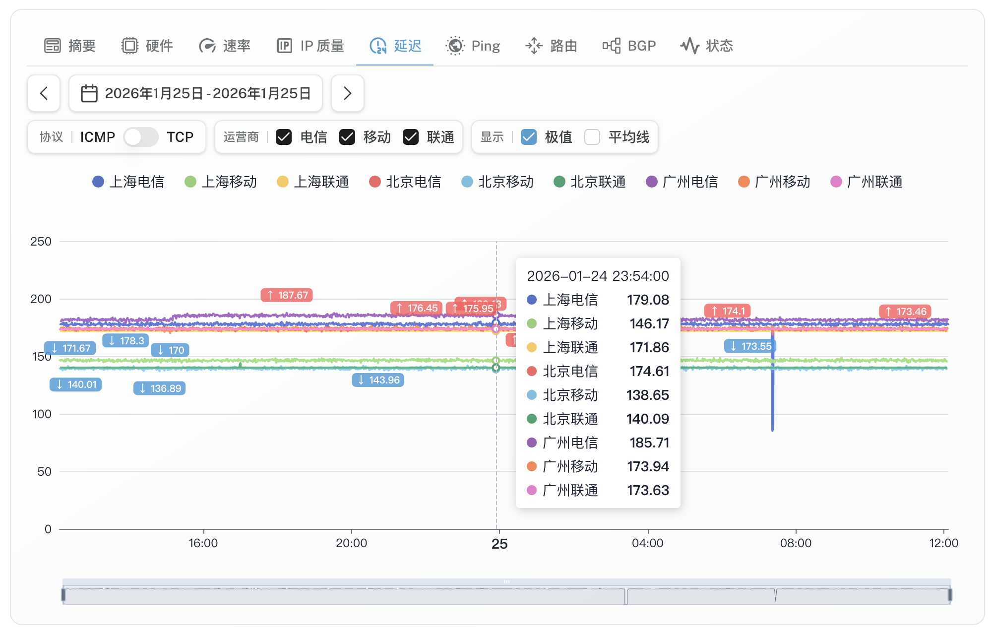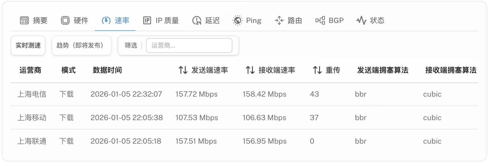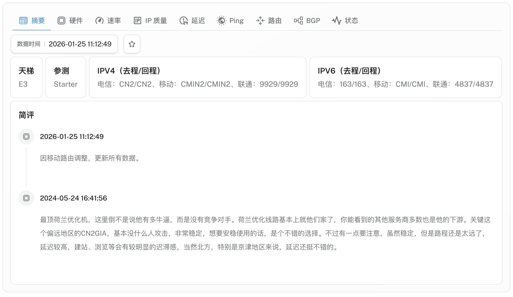 规格: 摘要: 硬件: 速率: IPv4 质量: IPv6 质量: ICMP 延迟: TCP 延迟: BGP IPv4: BGP IPv6: 如果各位小伙伴对该产品感兴趣,想要持续关注其实时与历史数据表现,欢迎访问我们的站点进行长期跟踪。