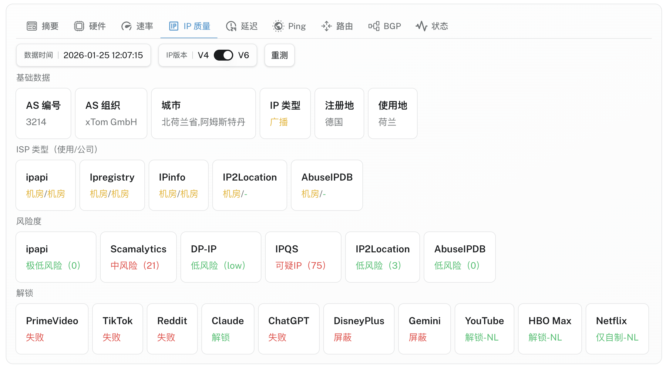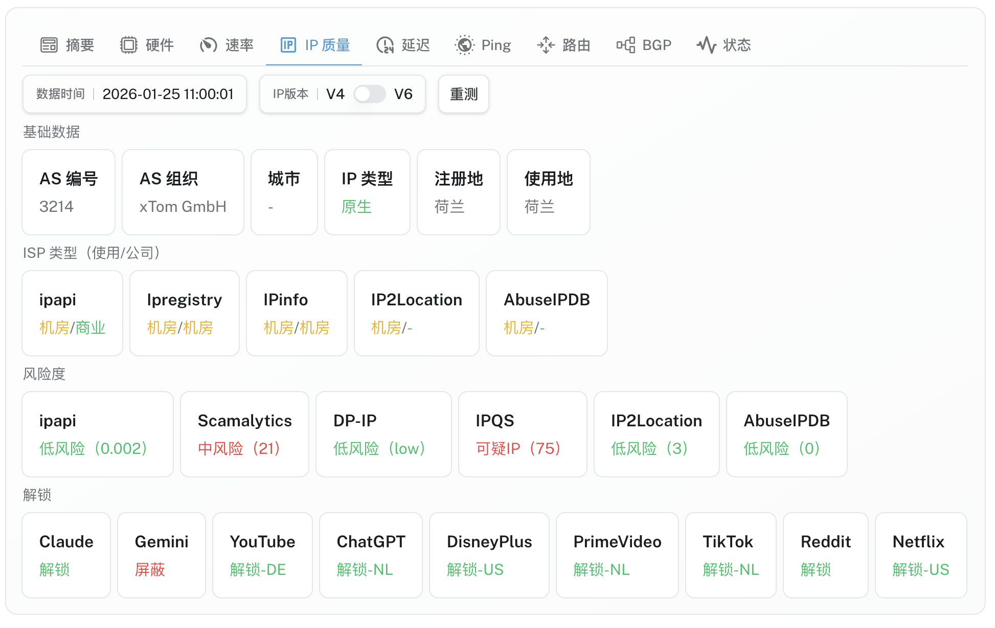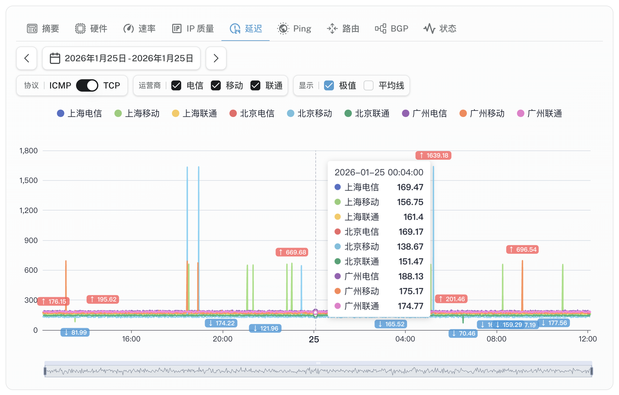规格: 摘要: 硬件: 速率: IPv4 质量: IPv6 质量: ICMP 延迟: TCP 延迟: BGP IPv4: BGP IPv6: 如果各位小伙伴对该产品感兴趣,想要持续关注其实时与历史数据表现,欢迎访问我们的站点进行长期跟踪。