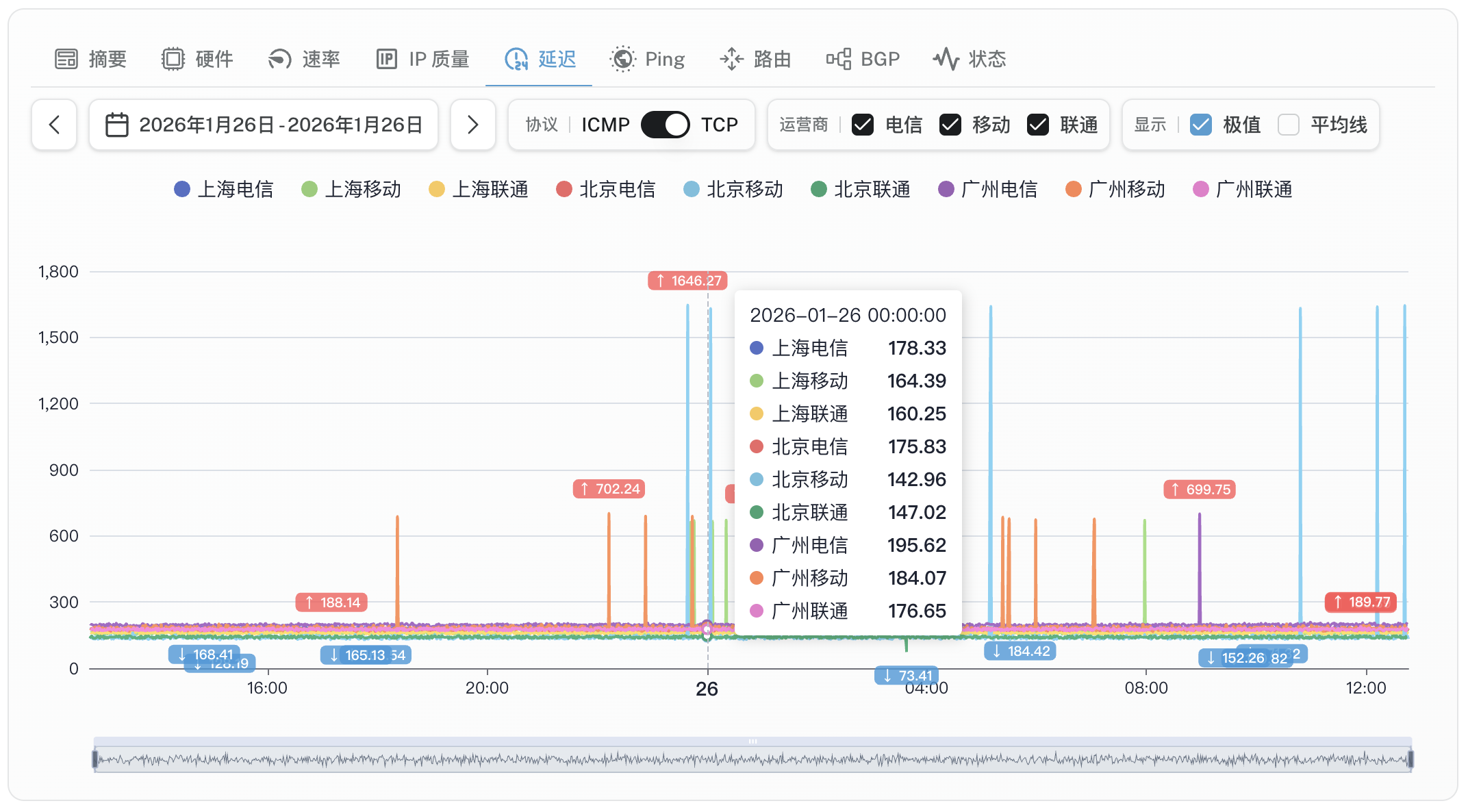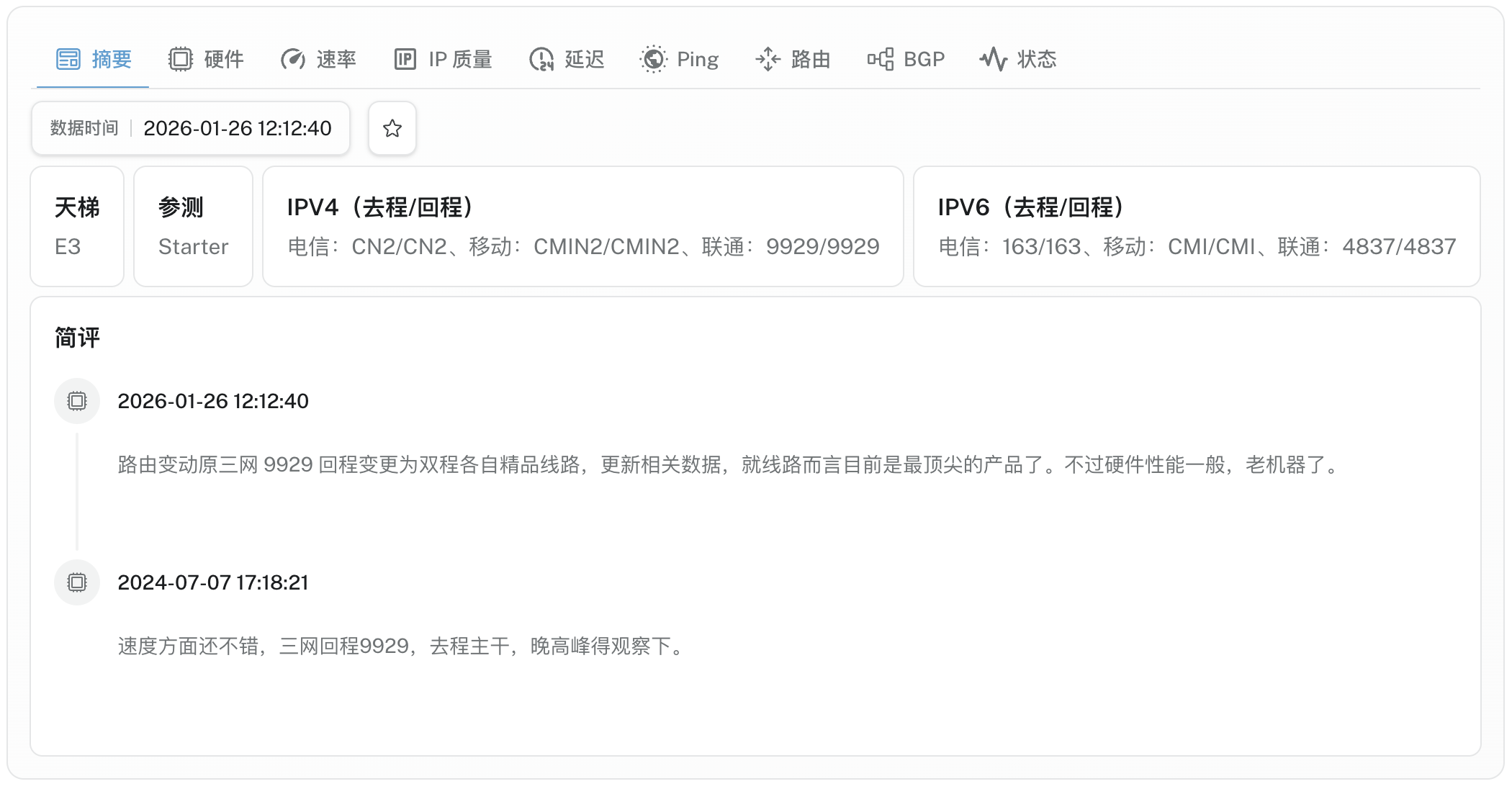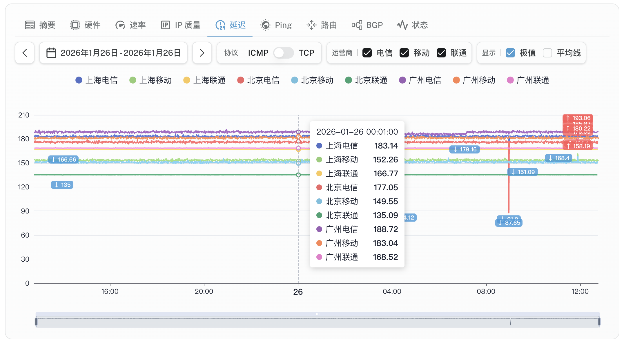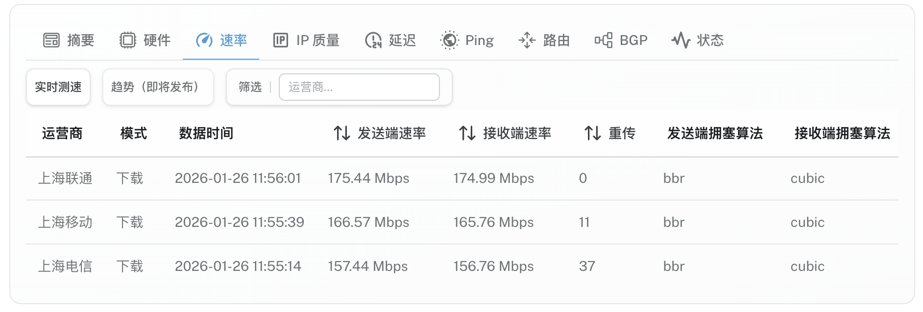 规格: 摘要: 硬件: 速率: IPv4 质量: IPv6 质量: ICMP 延迟: TCP 延迟: BGP IPv4: BGP IPv6: 如果各位小伙伴对该产品感兴趣,想要持续关注其实时与历史数据表现,欢迎访问我们的站点进行长期跟踪。