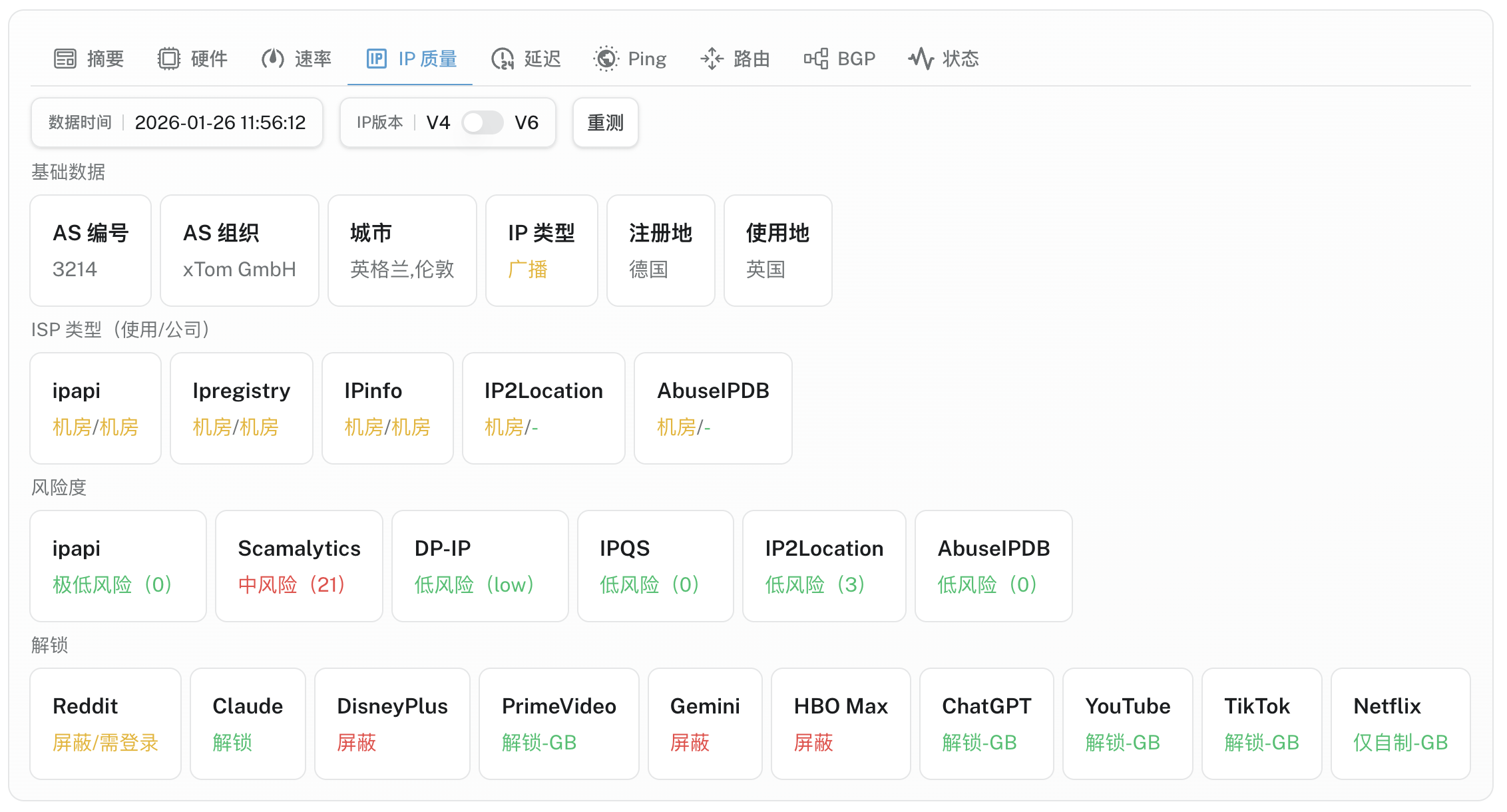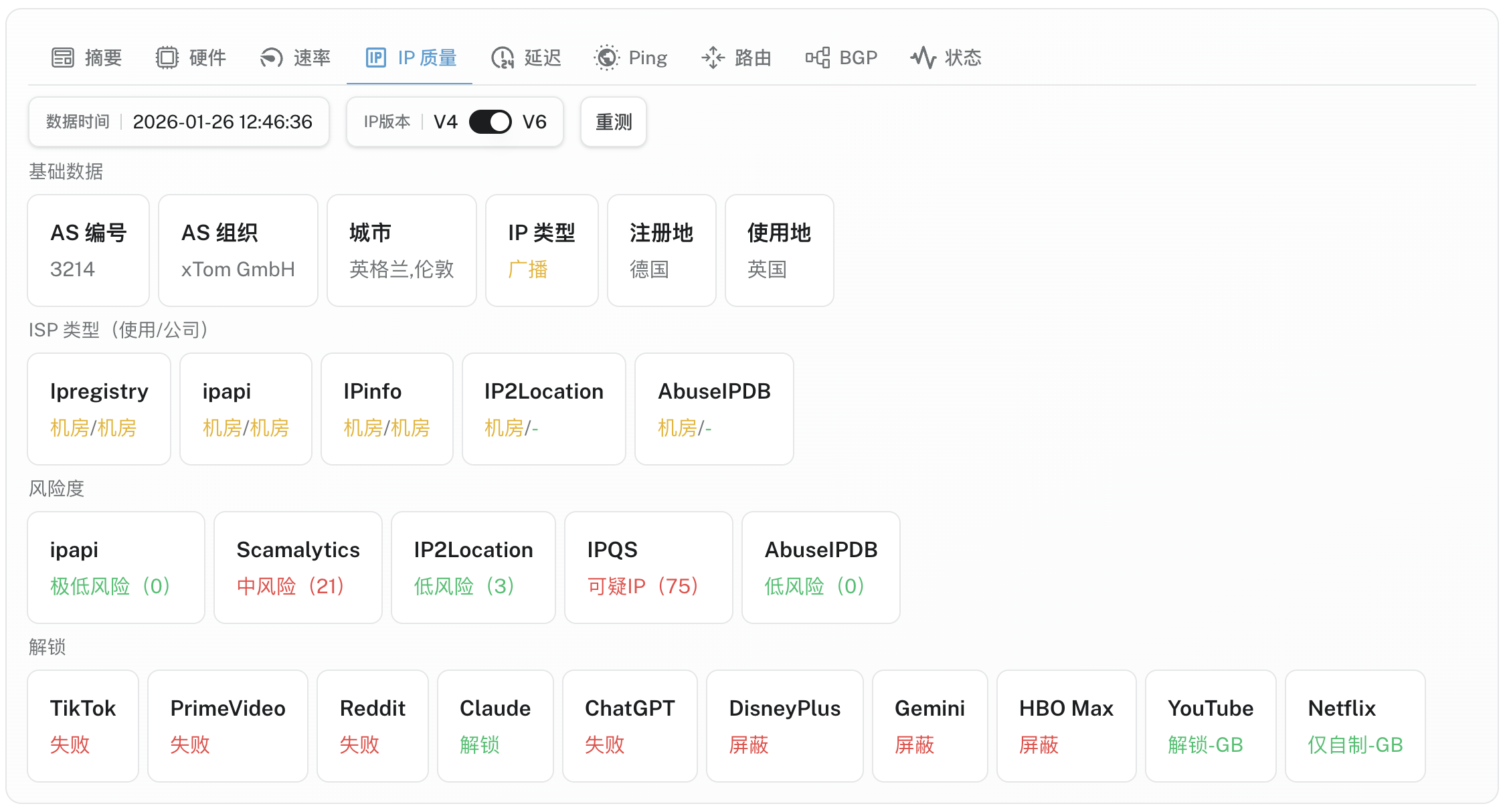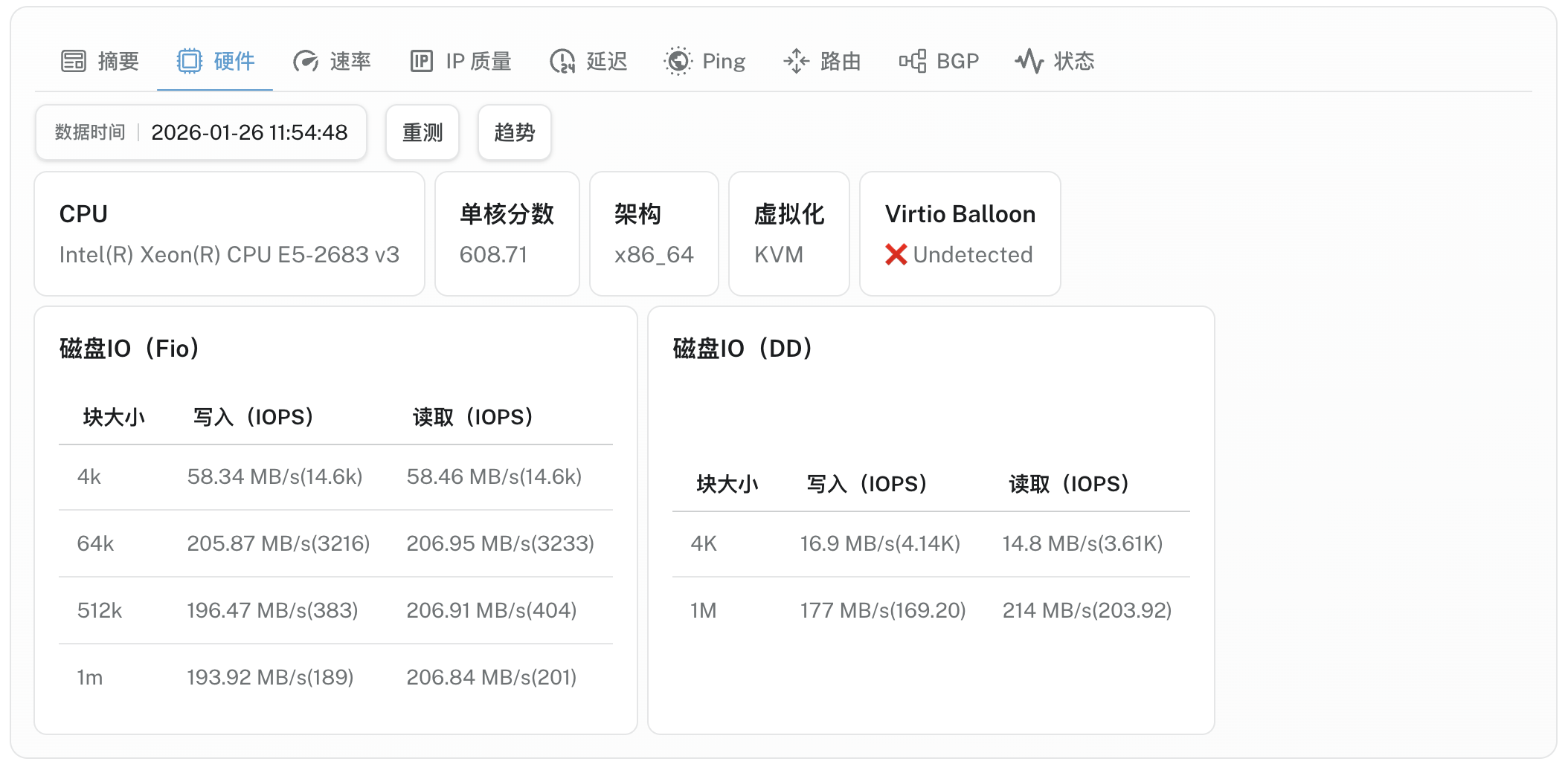 规格: 摘要: 硬件: 速率: IPv4 质量: IPv6 质量: ICMP 延迟: TCP 延迟: BGP IPv4: BGP IPv6: 如果各位小伙伴对该产品感兴趣,想要持续关注其实时与历史数据表现,欢迎访问我们的站点进行长期跟踪。